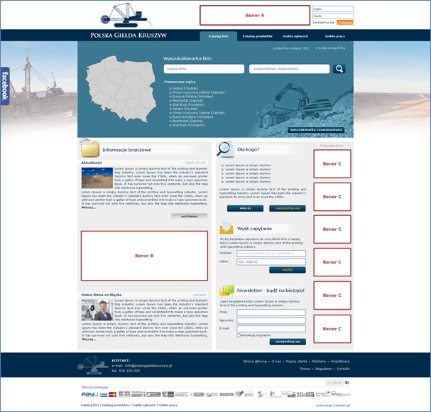 W serwisie wydzielone zostały miejsca, w których mogą Państwo zaprezentować swoją firmę w formie banera reklamowego. Rozmieszczenie banerów na portalu zostało zaprezentowane na poniższym rysunku. Publikowane banery to banery rotacyjne (przeglądając portal w danym miejscu pojawia się baner kilku firm).